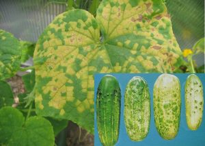 بوته های خیار و سایر کدوییان معمولا هفته های اول در مزارع آلوده می شوند و چندین روز پس از آلودگی لپه ها زرد و پژمرده می شود و برگ های جوان چین خورده – کوچک و به سمت بالا انحناء پیدا می کند و علایم موزاییک را نشان می دهد همچنین فاصله میانگره ها کم و ساقه کوتاه شده در نتیجه رشد آن ها از 30 سانتی متر تجاوز نمی کند ( اندازه برگ های آلوده نصف برگ های سالم است ) .